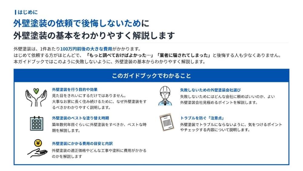 外壁塗装をお考えの方に、この一冊で外壁塗装の基礎知識がひととおりわかるガイドブックを作成しました。